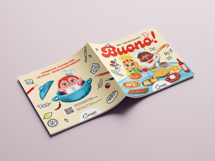 Für das Restaurant Caruso in Bonaduz durfte ich zwei Mal- und Rätselhefte illustrieren und gestalten. Die Hefte bieten den kleinen Gästen eine kreative und unterhaltsame Beschäftigung, während sie gespannt auf ihre leckere Pizza warten.